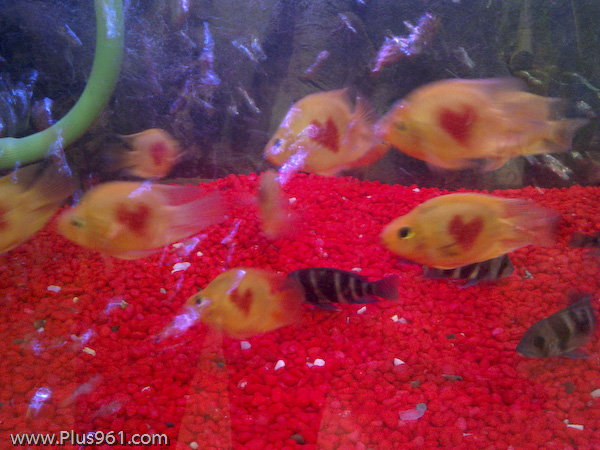 Putting a red ribbon on a small cat or dog is understood, but drawing a red heart on a gold fish is a bit too much… no? But hey, it’s Valentine! Everyone wants to make more money on this day including pet shops!